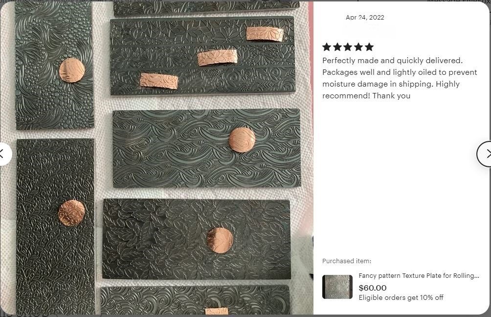 This steel texture plate is made from cold rolled mild steel and can be used with a hydraulic press, rolling mill or hammering by hand. Non-ferrous metals work best with the plate such as silver, copper and brass. This plate can be used multiple times.